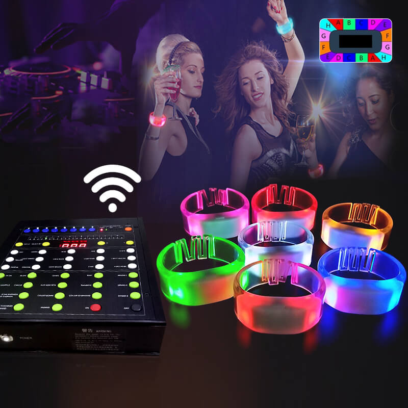 Vòng đeo tay điều khiển từ xa là xu hướng công nghệ phát sáng led hiện đại thuộc dòng dụng cụ cổ vũ chuyên nghiệp và đẳng cấp. Kết hợp với bộ điều khiển từ xa cự li 300-500 mét, vòng đeo tay giúp tạo hiệu ứng ánh sáng led 15 màu, phân khu vực phát sáng đẹp lung linh mang lại sự thành công lớn cho các đêm nhạc hội, quẩy bar, party hoành tráng....